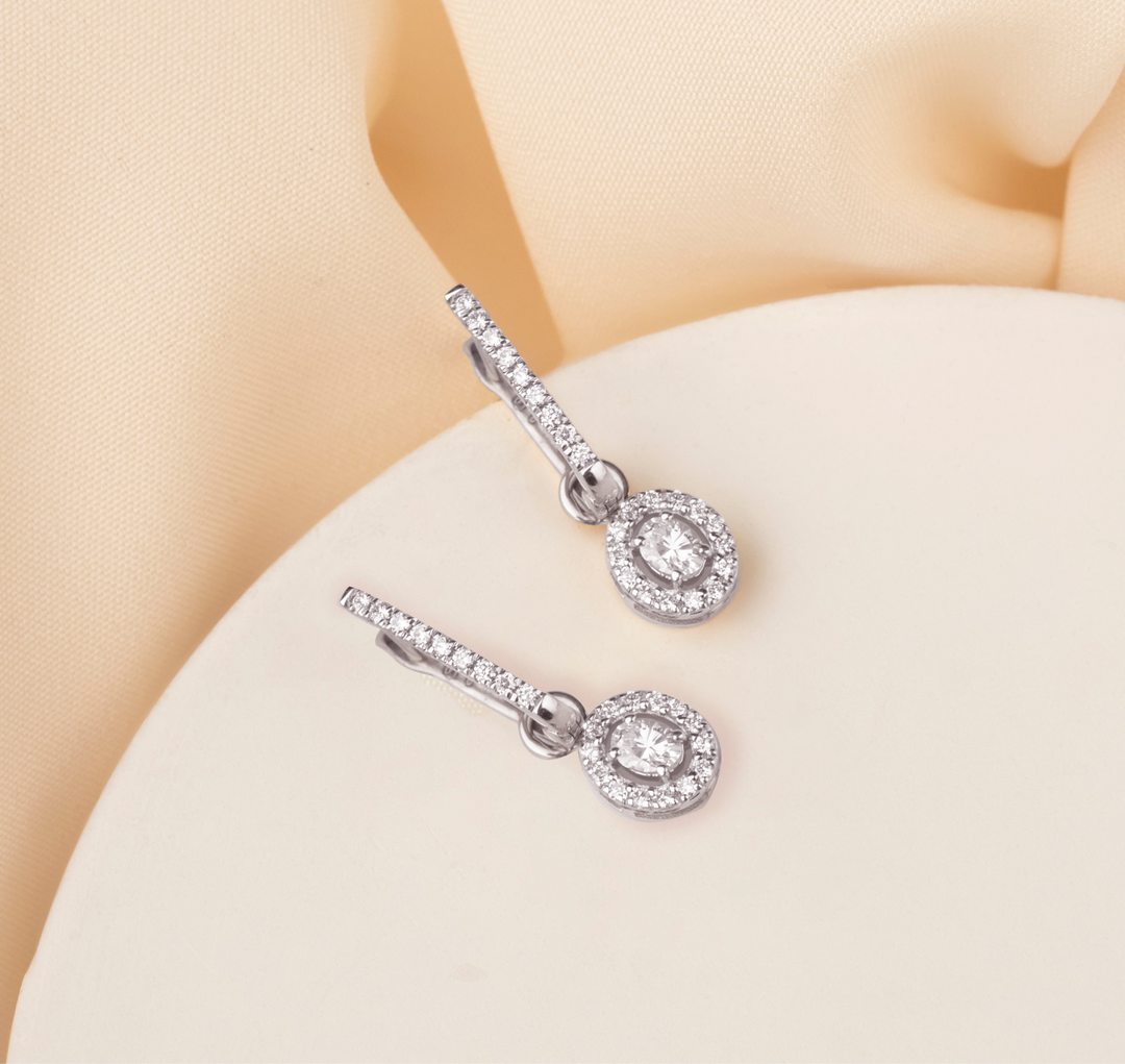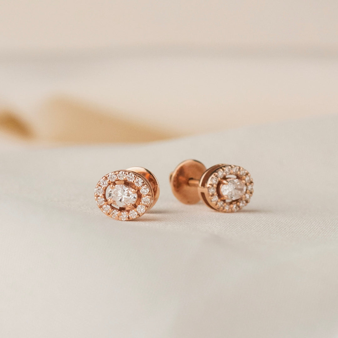 18K Gold Oval Shaped Diamond Earrings with Halo