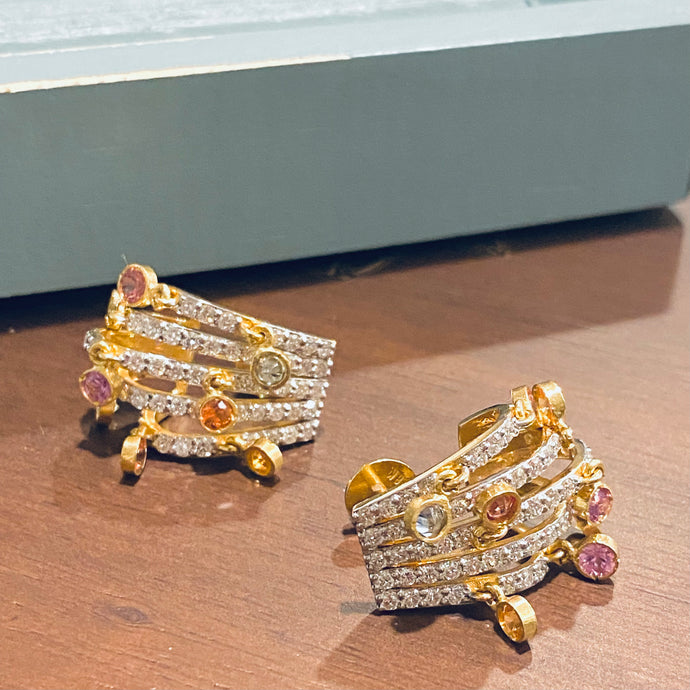 • 18K Gold 5-Line Diamond Earrings with Colored Sapphires